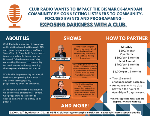 Club Radio is a non-profit low power radio station based in Bismarck, ND. Operating as a ministry of New Song Community Church, Club Radio strives to "expose darkness with a club" by connecting listeners to community-focused events and by playing uplifting music that encourages our listeners. We do this by partnering with local business, supporting local events, and broadcasting good, clean music over the airwaves.